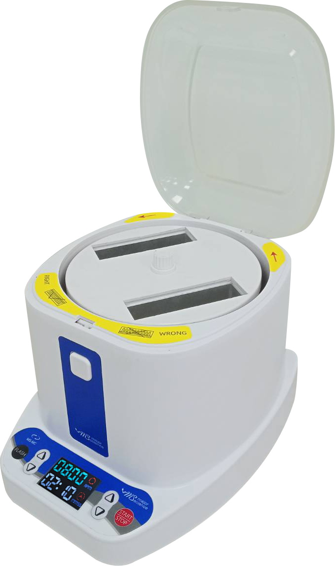 The MS-MC is an ideal, easy-to use solution for the centrifugation of 96-well standard microplates, ELISA plates or PCR plates (with or without skirts). The top lid opens to 95° for convenient microplate loading and unloading and the instrument generates low noise during operation.