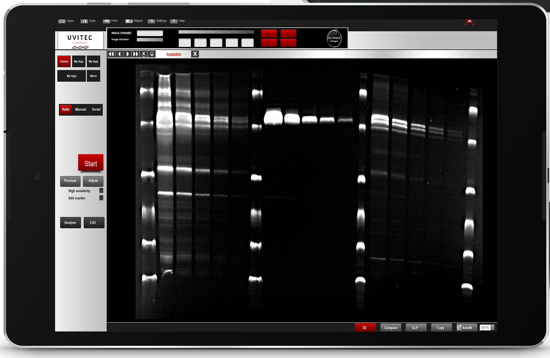 The UVITEC Alliance Q9 Advanced AUTOMATED version is a unique imaging system based on the latest proprietary optics and a super-cooled 9.2 megapixel, 16-bit pixel depth CCD camera. When combined with an extremely bright lens (f0.80) the Q9's optical system exhibits very low noise, superb sensitivity and resolution, which makes it ideal for visible light, blue light, fluorescence, chemiluminescence (Western blot), chemifluorescence, bioluminescence, IR/NIR and multiplexed imaging applications.