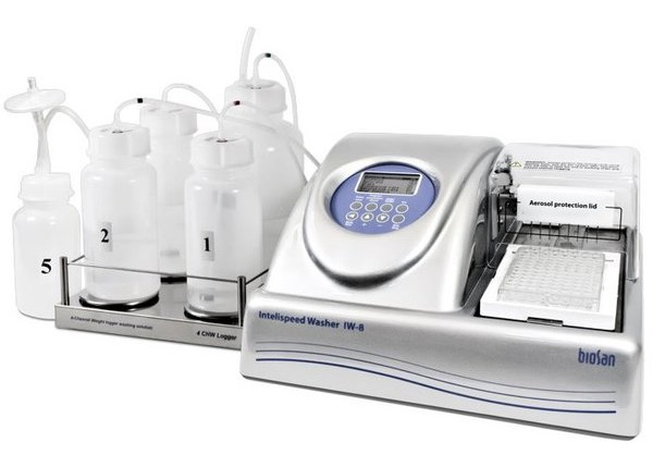 The IW-8 Inteliwasher microplate washer from Biosan has been developed for washing standard flat bottom 96-well microplates and microstrips. The unit has capacity for one waste bottle and three wash bottles with independent dispensing channels.
